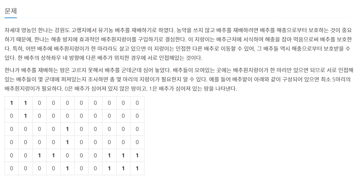// 상하좌우 중에 배추가 있다면 인접한 경우이므로